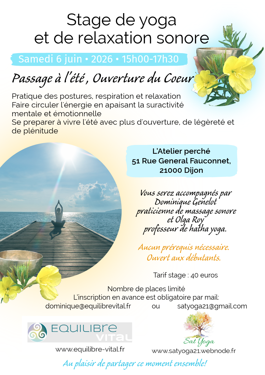Samedi 6 juin Stage de yoga et de méditation sonore "Accueillir l'été" 15h00-17h30 L'Atelier Perché, Dijon