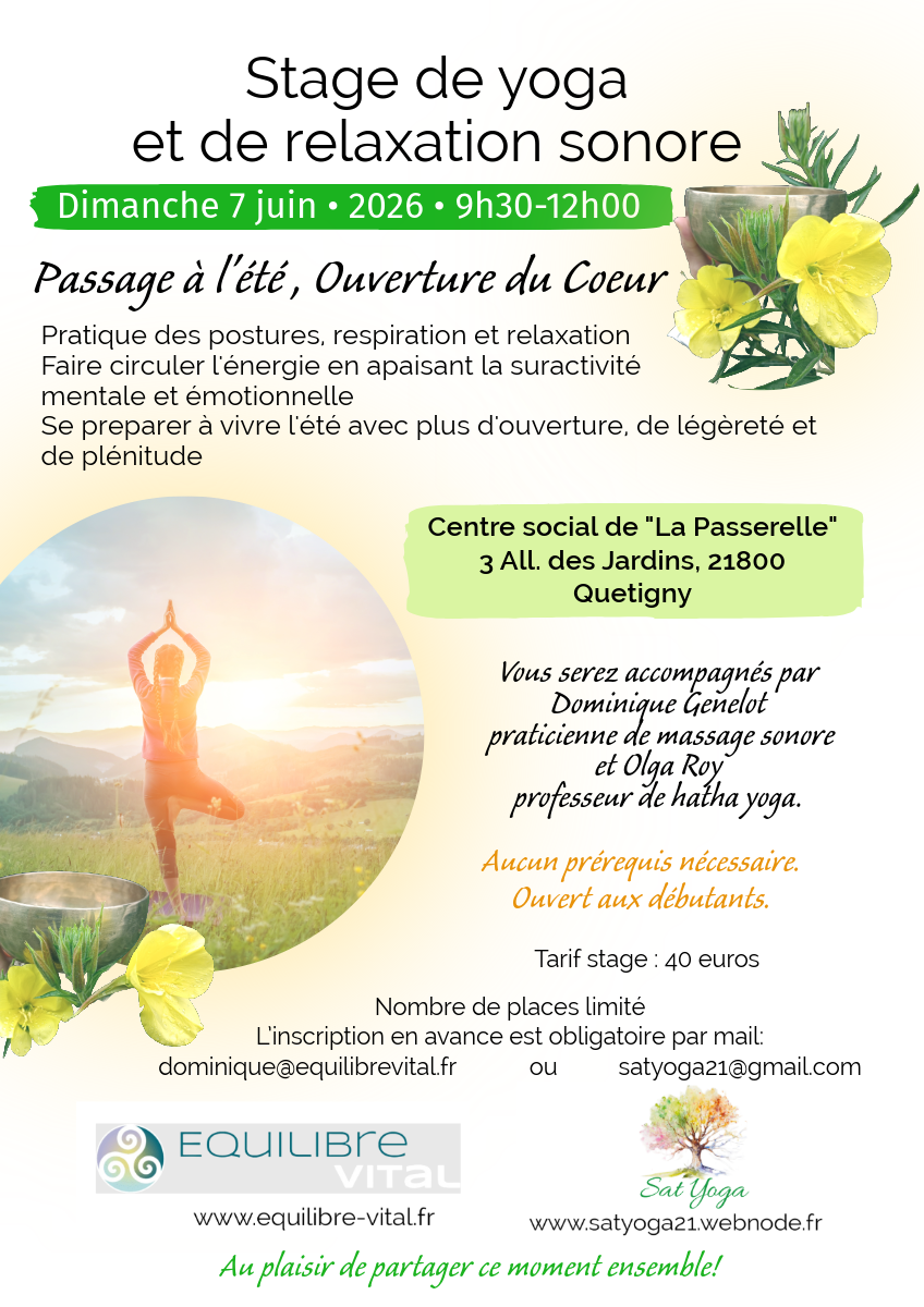 Dimanche 7 juin Stage de yoga et de méditation sonore "Accueillir l'été" 9h30-12h00 La Passerelle, Quetigny